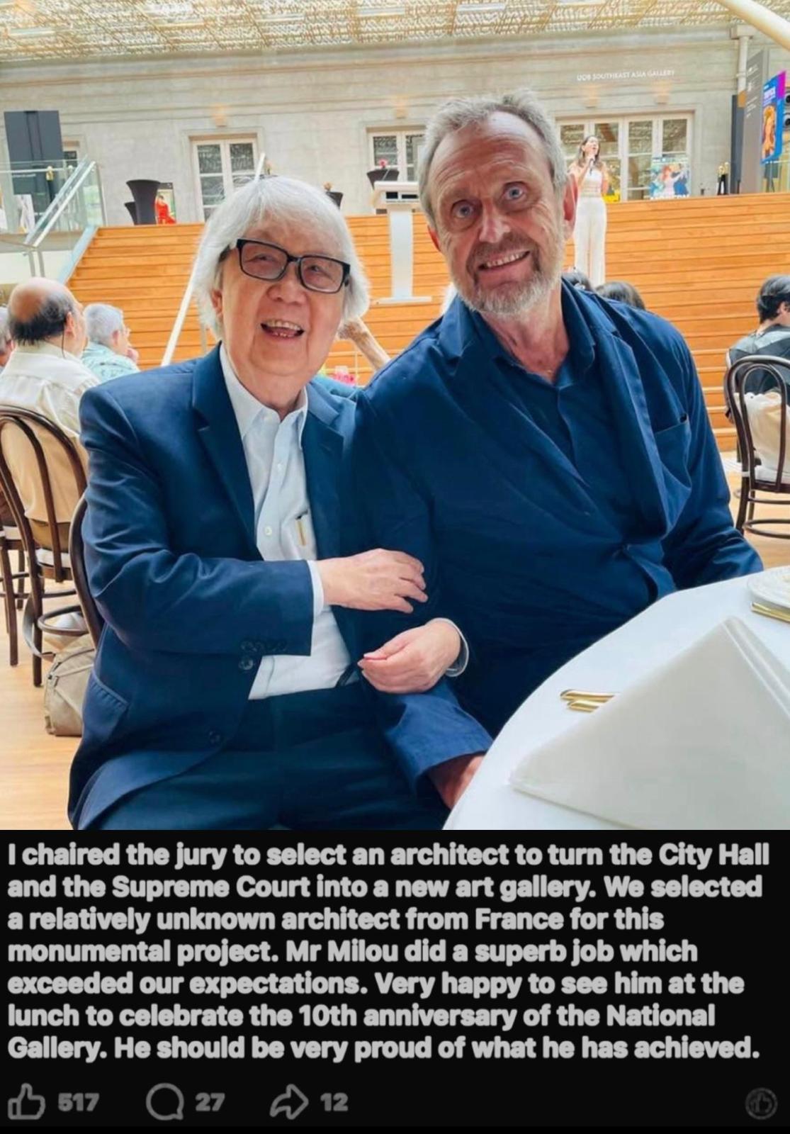 In 2015, the National gallery competition jury members visited the gallery after completion , Tommy Koh chairman of the jury told after the visit « the jury said that Jean Francois has vindicated our faith in him and exceeded our expectation »